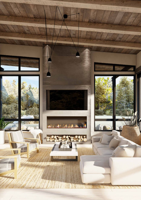 Perched above a creek and nestled among aspens, the Bridger Canyon custom residence is designed as a four-season retreat that celebrates views, connection, and comfort. Anchored by a dramatic shed roof oriented toward the Bridger Mountains, the home captures 270-degree views from the great room while maintaining a grounded, horizontal presence through layered steel beams, wood purlins, and rhythmic window repetition. A sunken living room creates intimacy within the open plan, while a void in the roof at the lounge area forms a tranquil zen garden, inviting sky views and quiet reflection into the heart of the home. Inside, spacious gathering areas—including a generous kitchen, movie room, bunk room, gym, and en-suite bedrooms—support both lively entertaining and everyday living. Outdoor spaces are equally considered, with a covered terrace, fire pit, and protected cooking area oriented toward Bridger Creek. Across the property, a party barn offers room for games, meals, and access to a five-stand range, ponds, and horse corral. Rooted in its landscape and refined in its detailing, the home is a dynamic retreat designed for family, friends, and the rhythms of mountain life.